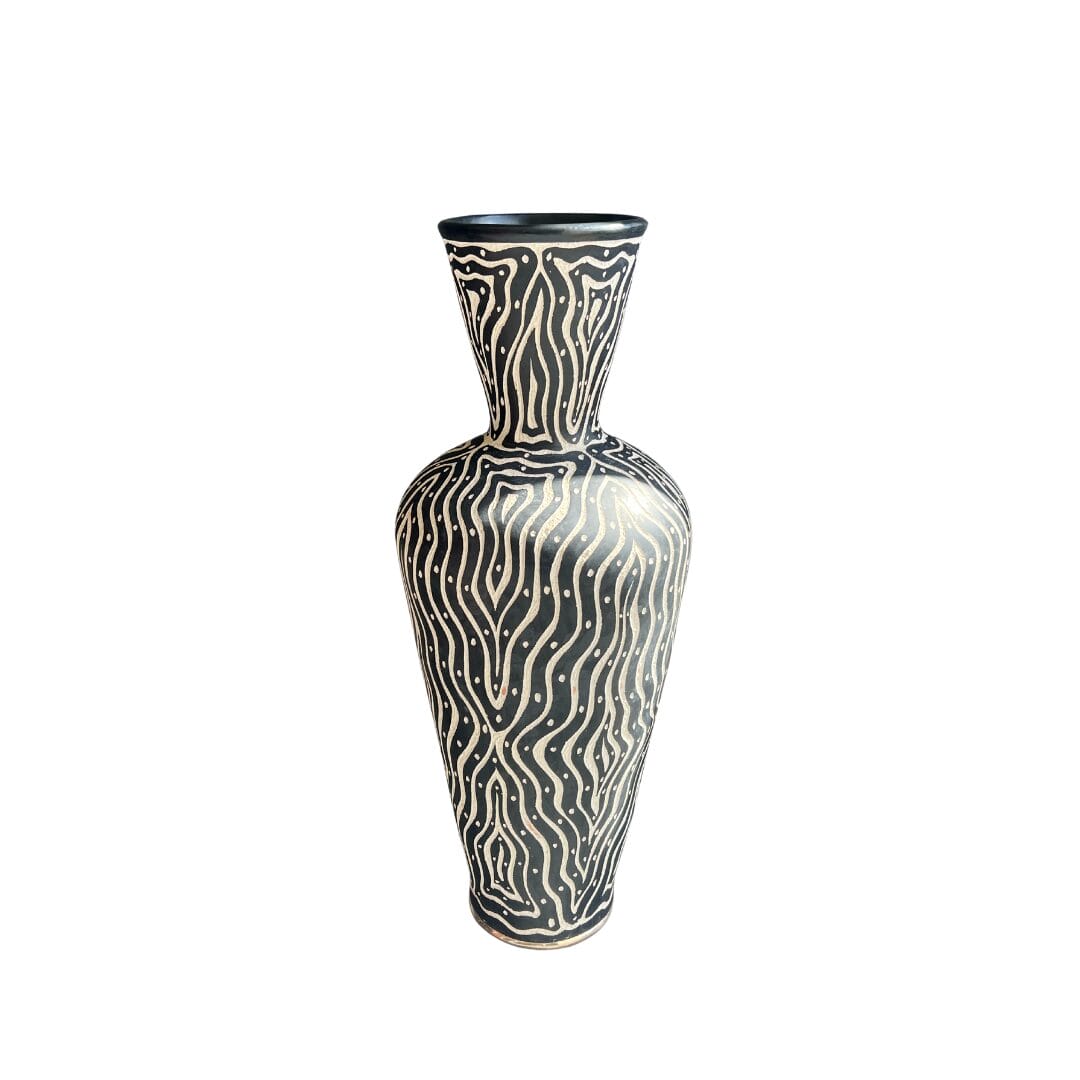 Découvrez notre jarre artisanale en céramique noire, sublimée par des motifs sculptés à la main. Cette pièce unique, façonnée selon un savoir-faire traditionnel, allie authenticité et élégance. Son design raffiné et ses détails gravés lui confèrent un charme particulier, idéal pour sublimer tout type d’intérieur. Placée seule ou accompagnée d’autres objets décoratifs, elle apportera une touche de caractère à votre espace.